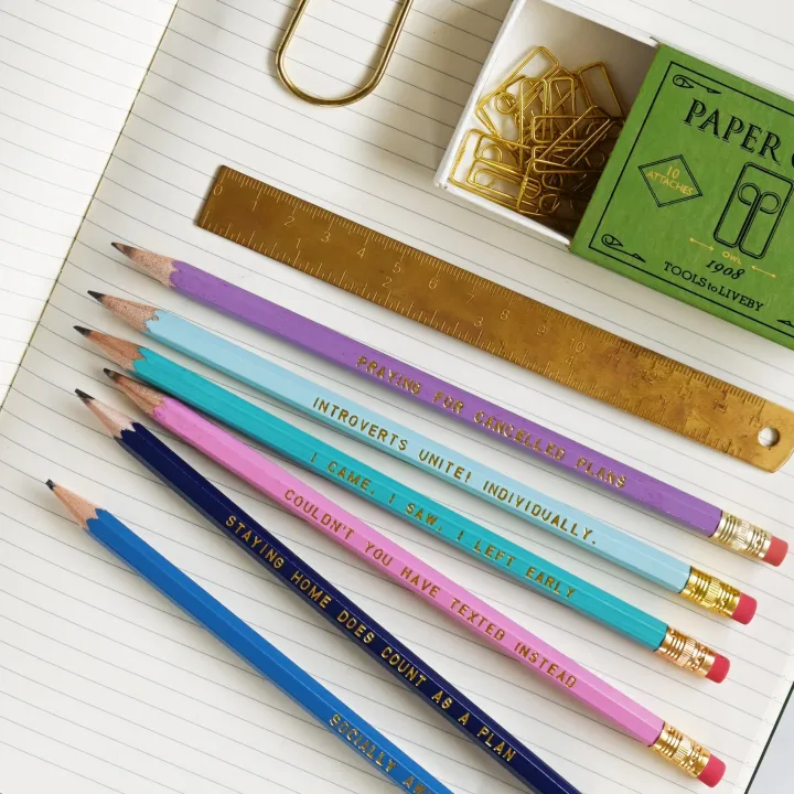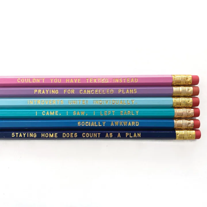 Set van 6 witty potloden met volgende opdrukken in goudfolie: