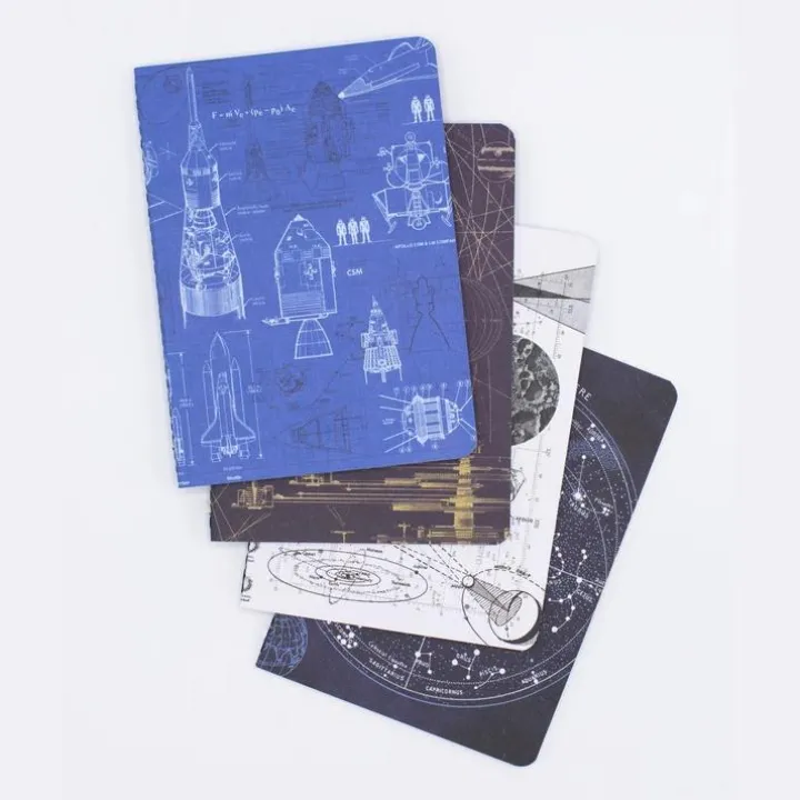 Schets sterrenbeelden, bereken de ideale baan voor de lancering of de formule van jouw eigen raketbrandstof. Dit pakket bevat 4 notitieboekjes met verschillende ruimtevaartcovers en verschillende types pagina’s. Altijd het juiste boekje voor jouw project van de dag.