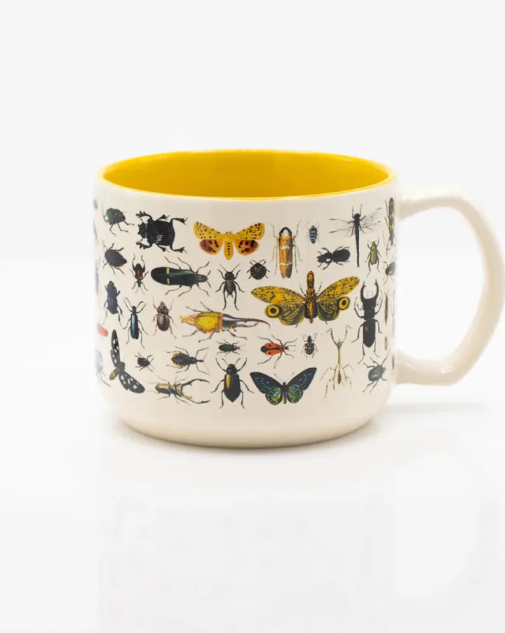 Deze keramische mok is voorzien van kleurenillustraties van onder meer prachtige vlinders, motten en kevers met een zonnige goudsbloemkleurige binnenkant.