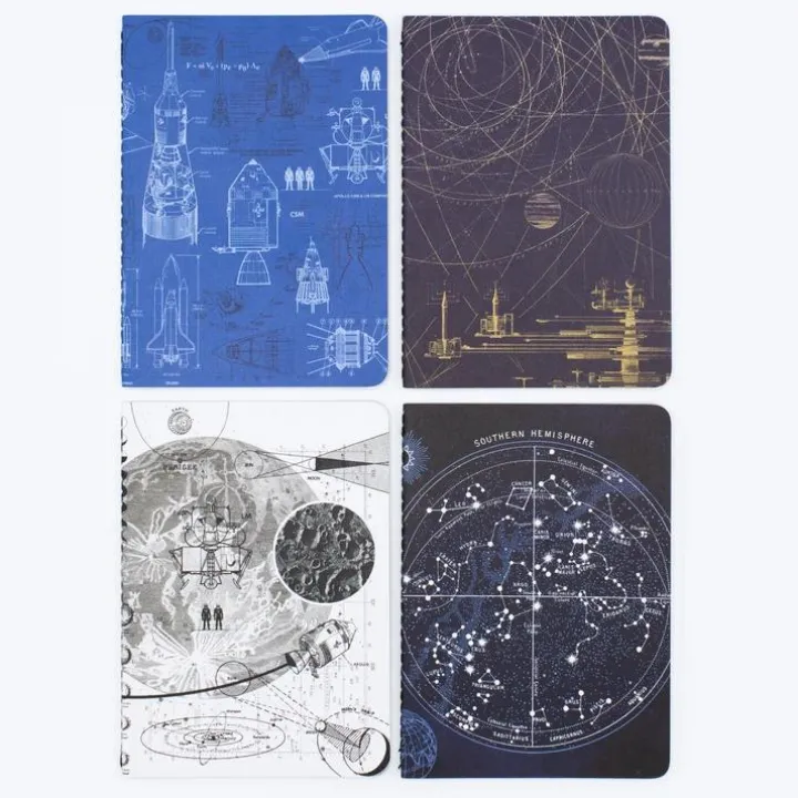 Schets sterrenbeelden, bereken de ideale baan voor de lancering of de formule van jouw eigen raketbrandstof. Dit pakket bevat 4 notitieboekjes met verschillende ruimtevaartcovers en verschillende types pagina’s. Altijd het juiste boekje voor jouw project van de dag.